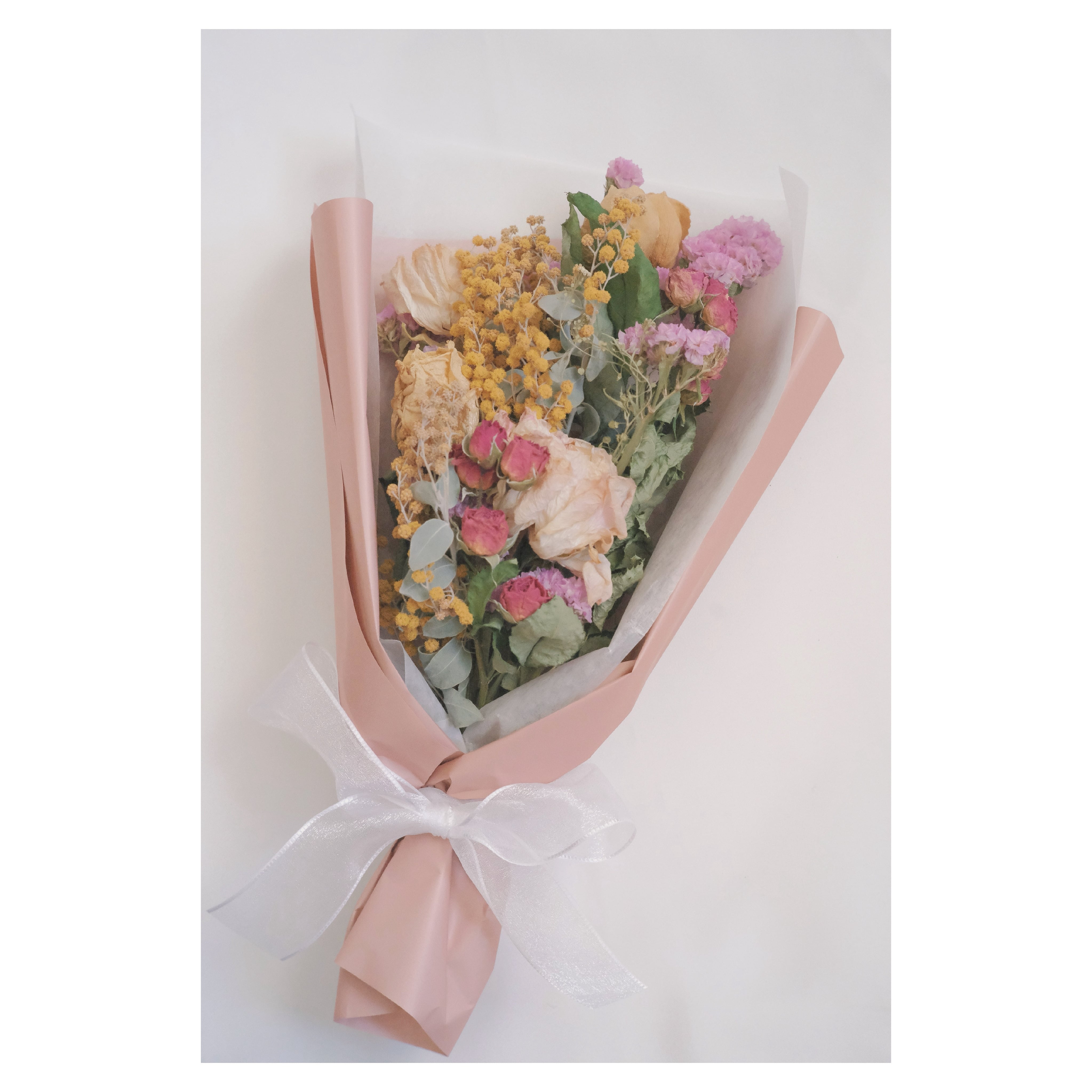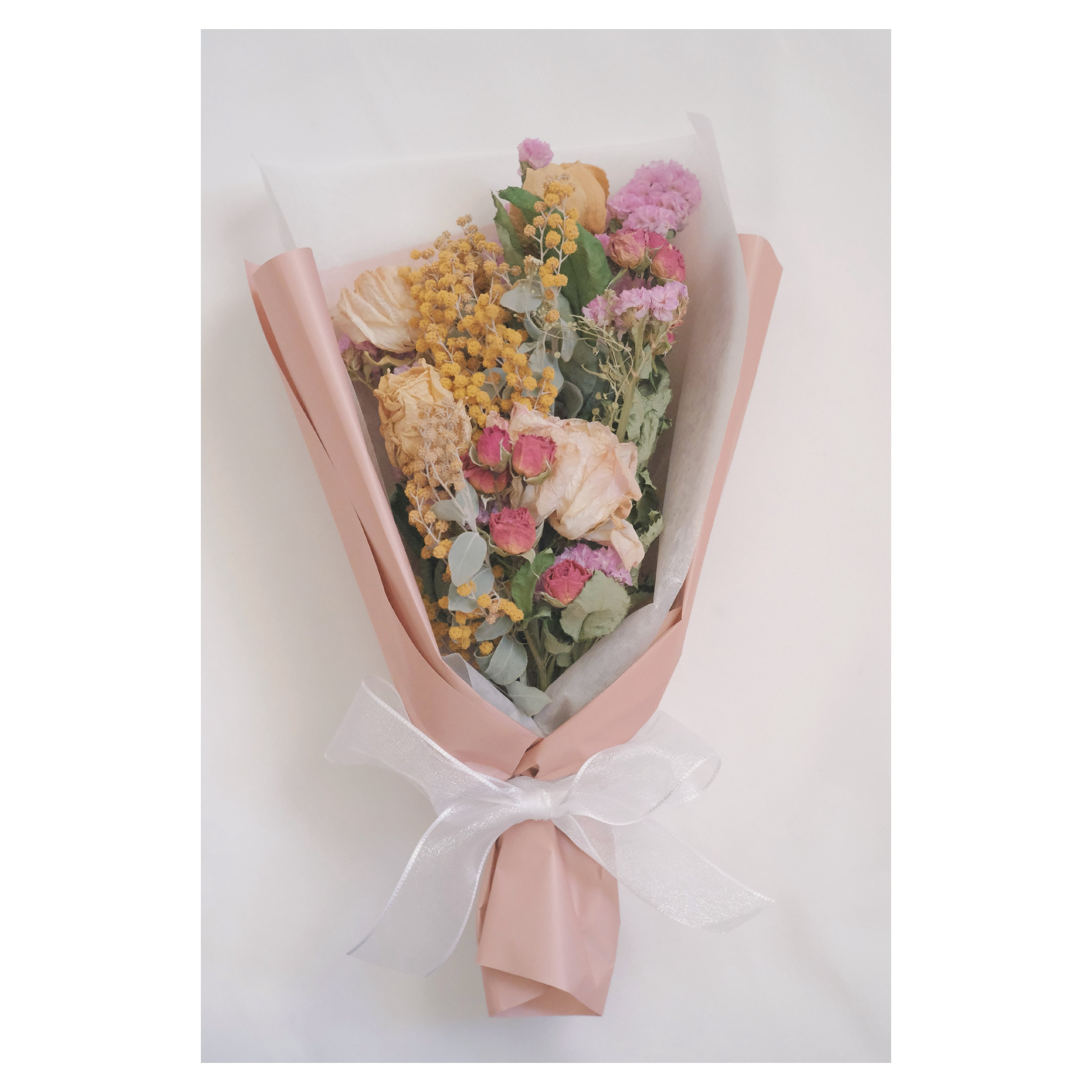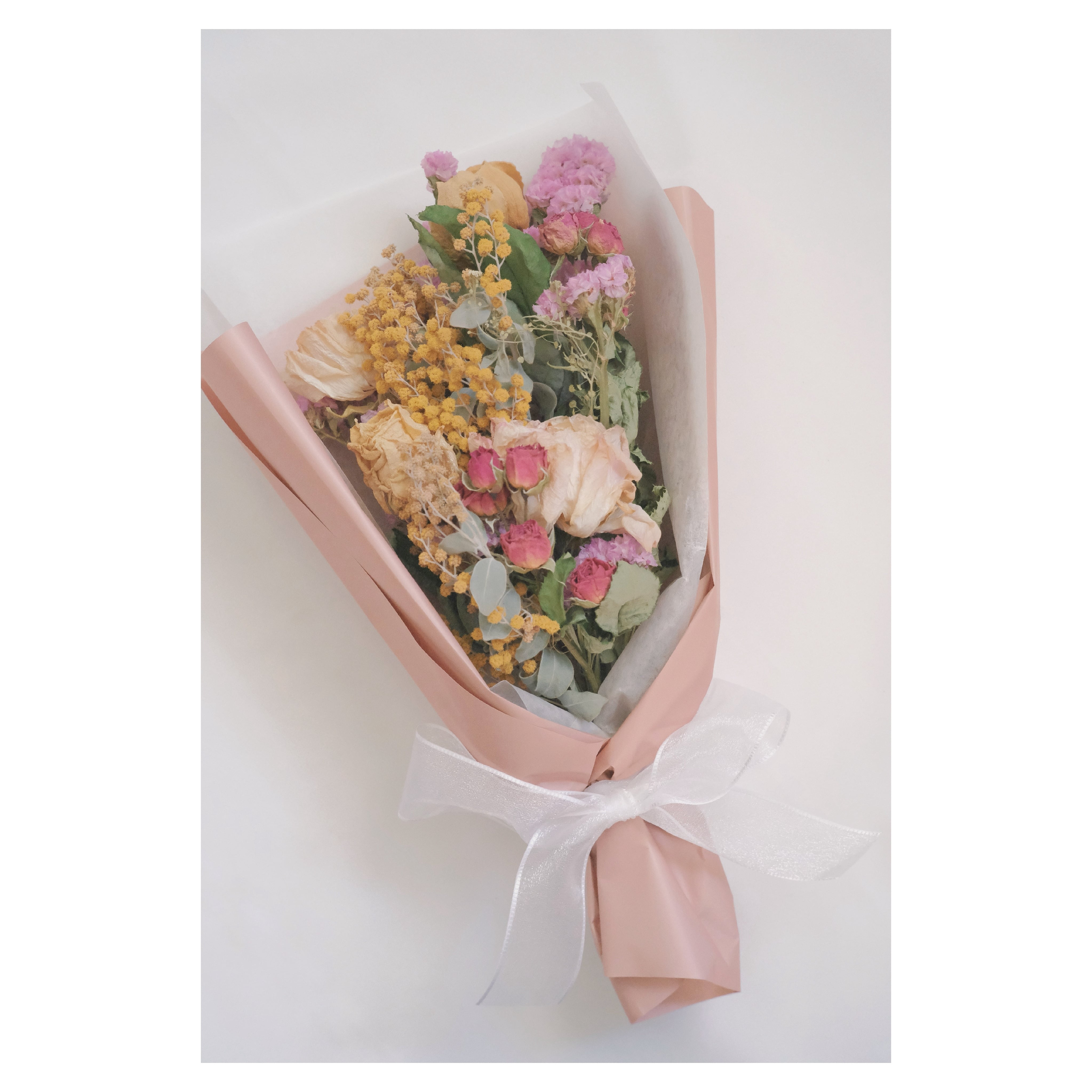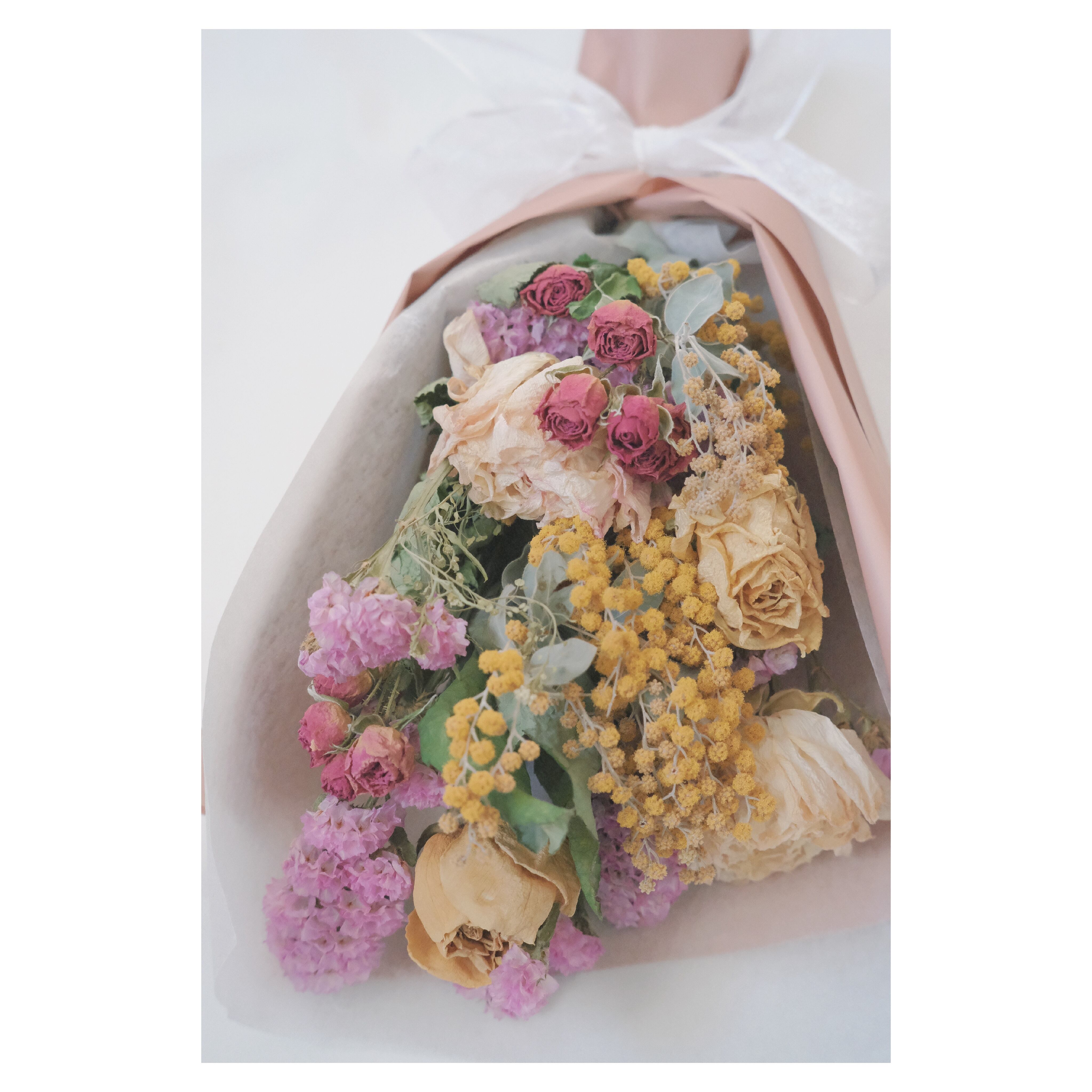 春色 ピンク色 黄色 赤色 可愛い 華やかな ミモザ バラ スターチス ラナンキュラス ドライフラワー ブーケ