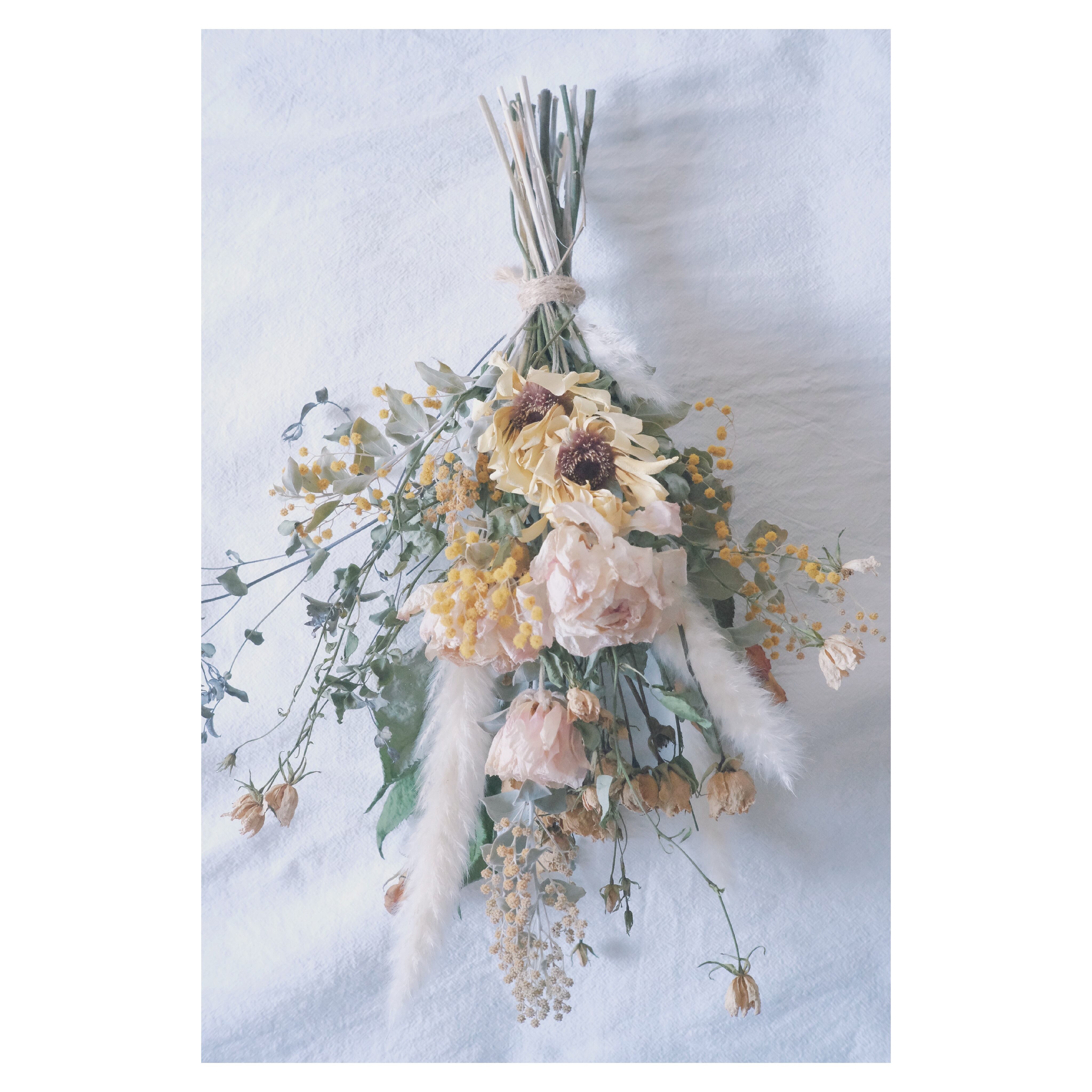 黄色 薄ピンク イエロー 淡色 優しい バラ ガーベラ ラナンキュラス ドライフラワー ブーケ スワッグ