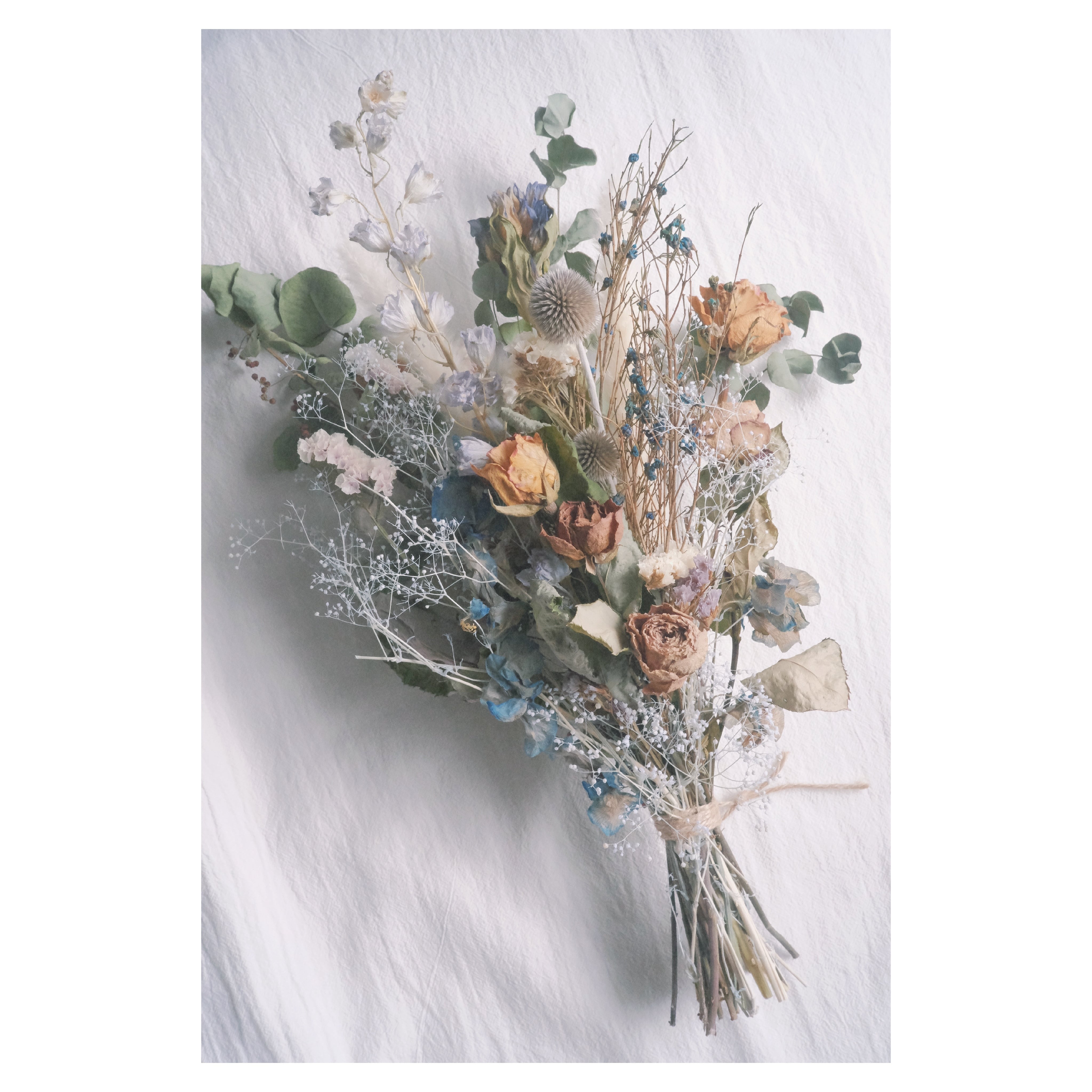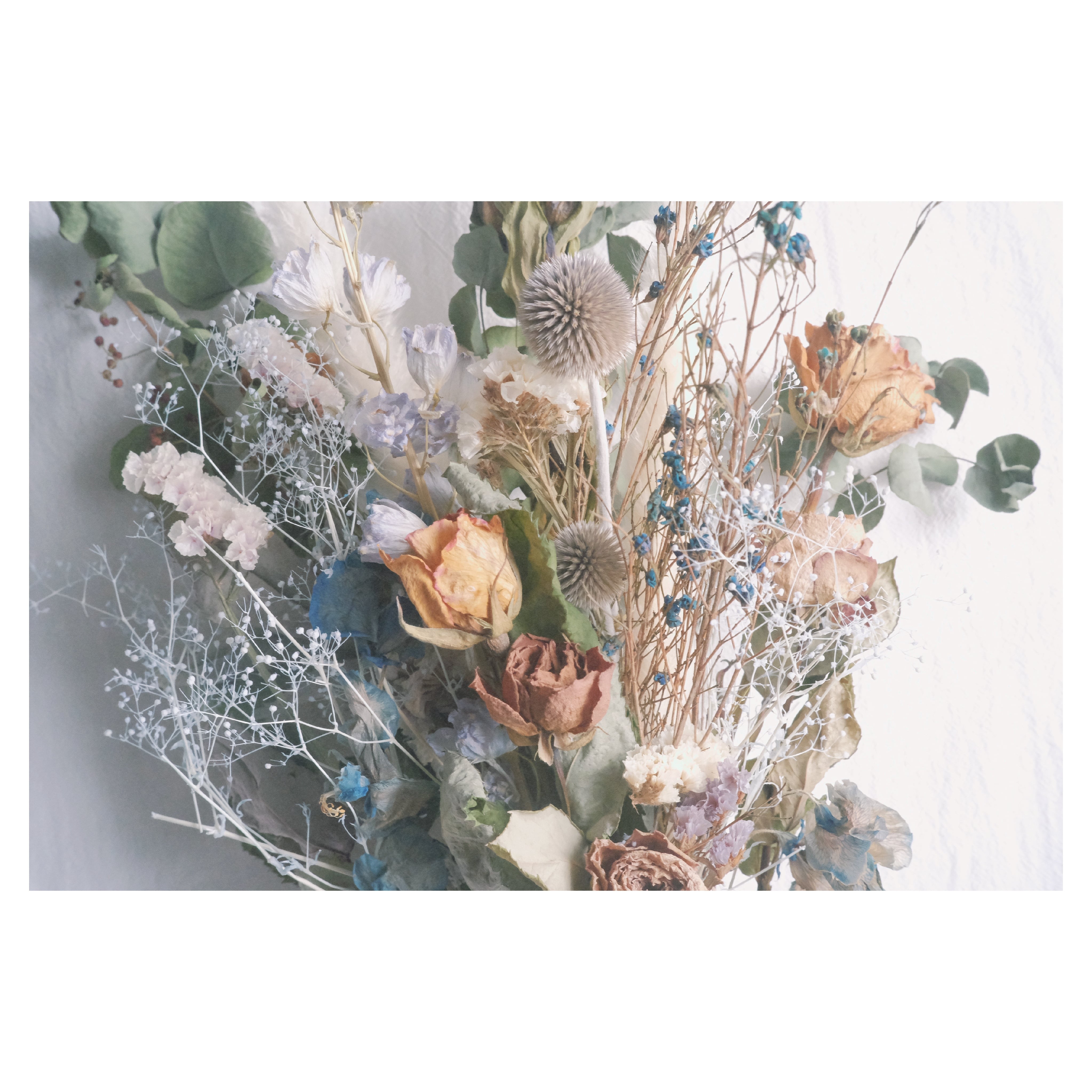 大人 ナチュラル 淡色 青色 ブラウン ベージュ ブーケ 優しい色 デルフィニウム ユーカリ ドライフラワー ブーケ スワッグ