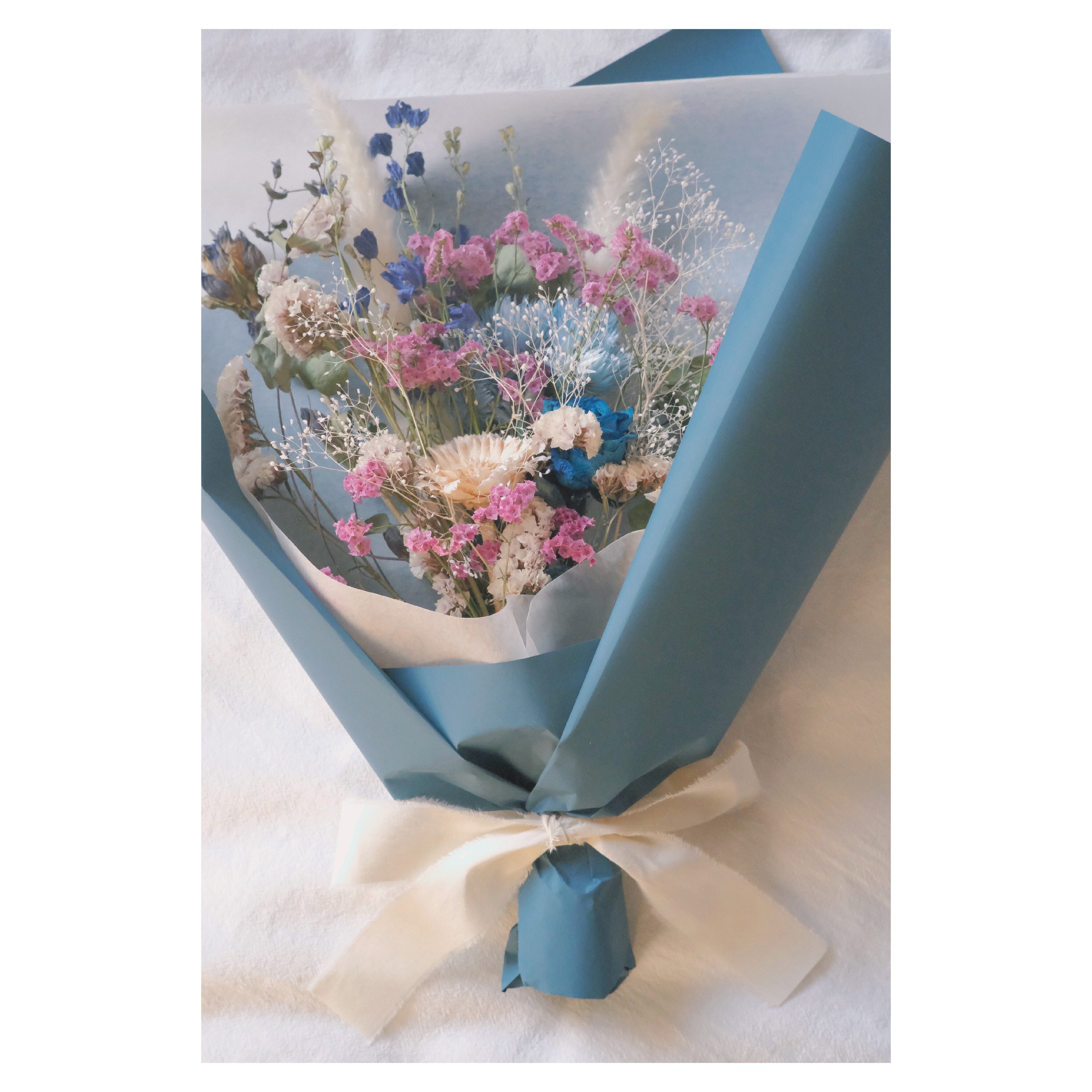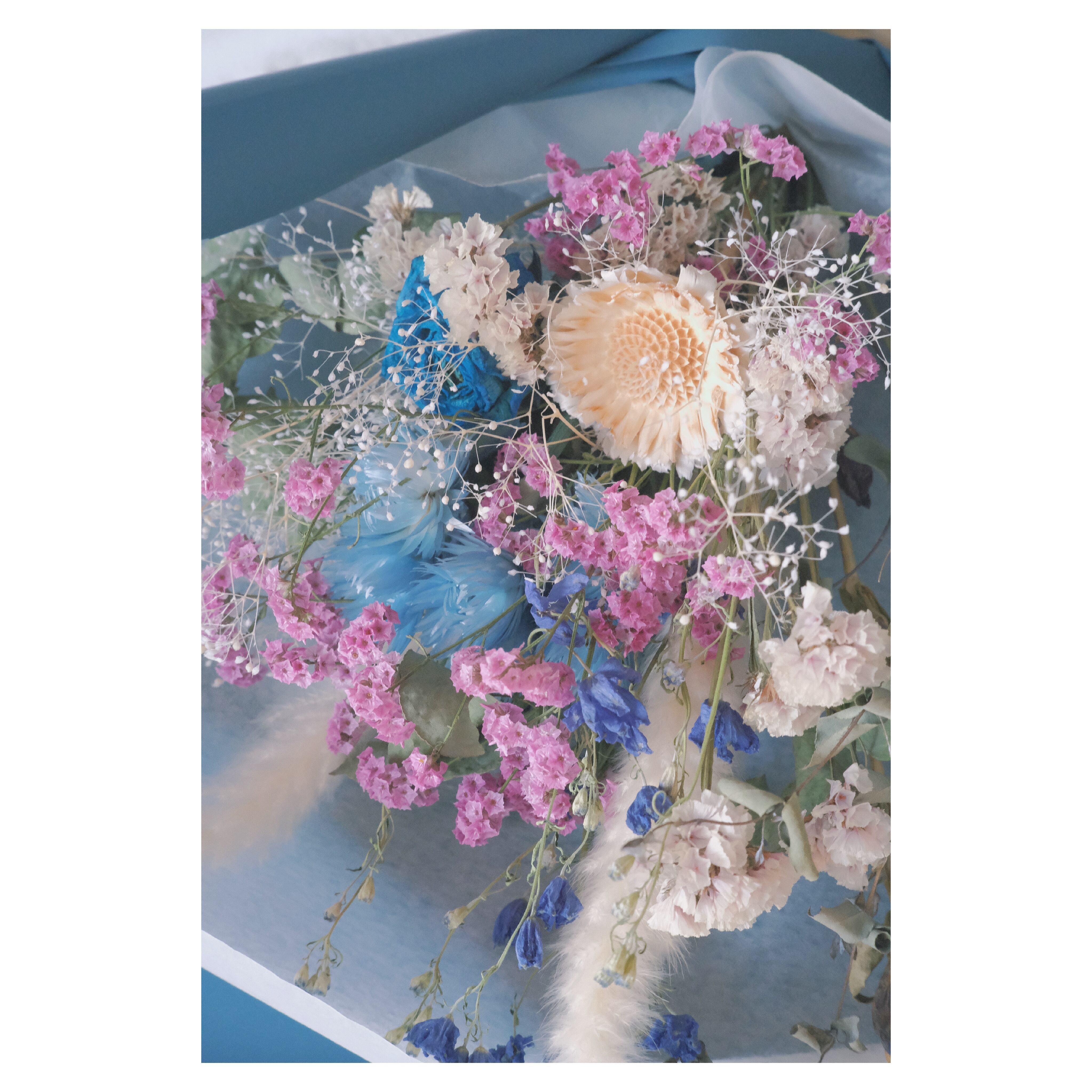 青 ピンク 白色 可愛い 綺麗 シック バラ カスミソウ スターチス デルフィニウム ドライフラワー ブーケ スワッグ