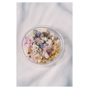 春のお花(ミモザや芍薬の花びら、マトリカリアなど)をとり入れつつ淡いピンクや黄色で作製しました。